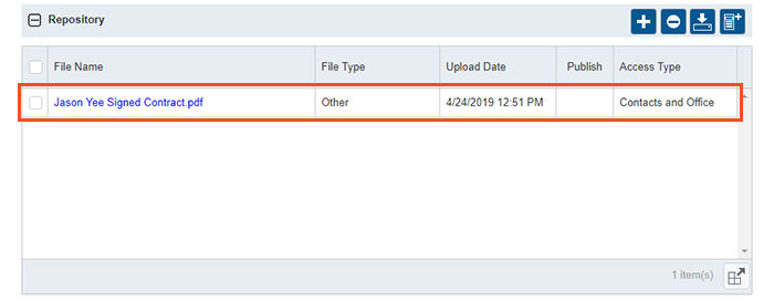 An example of what you might upload to a Contact Repository, would be a signed contract.