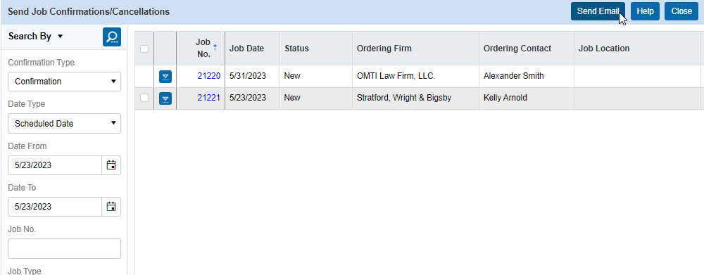 to display the jobs.- Select all the jobs displayed by clicking the checkbox in the top-left corner of the results. (If some jobs do not have an available checkbox to check, that means there is no email address designated in the Contact setup to receive job confirmations.)